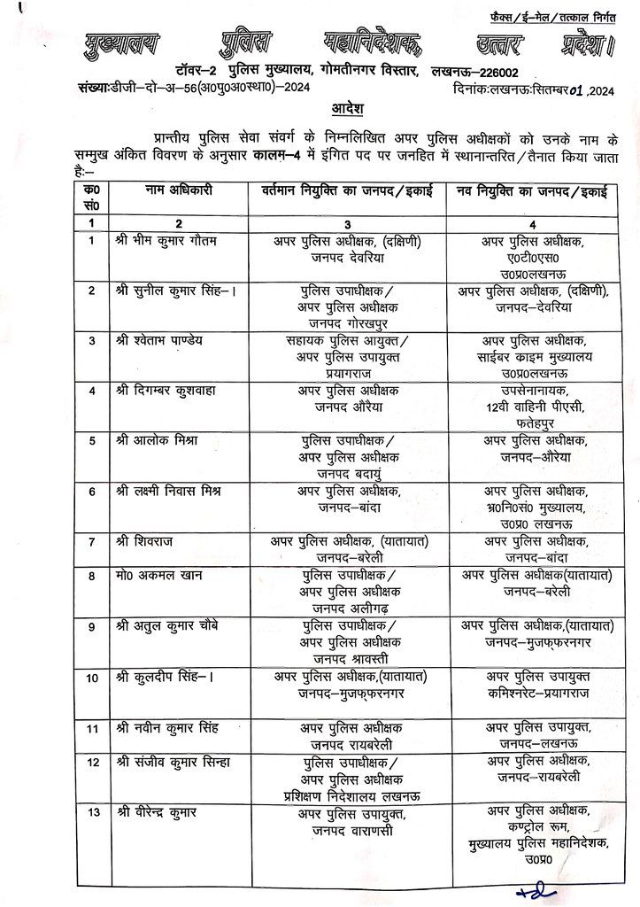 सरकार के आदेश के बाद भीम कुमार गौतम को ASP एटीएस लखनऊ, स्वेताभ पांडेय ASP साइबर क्राइम मुख्यालय, सुनील कुमार सिंह-1 ASP दक्षिणी देवरिया, दिगंबर कुशवाहा उपसेनानायक 12वीं वाहिनी PAC फतेहपुर, आलोक मिश्रा ASP औरैया, शिवराज ASP बांदा बनाया गया है। इसके अलावा लक्ष्मी निवास मिश्रा ASP भ्रष्टाचार निवारण मुख्यालय, मो.अकमल खान ASP ट्रैफिक बरेली, अतुल कुमार चौबे ASP ट्रैफिक मुजफ्फरनगर, कुलदीप सिंह-प्रथम ADCP प्रयागराज, नवीन कुमार सिंह ADCP लखनऊ बनाया गया है।