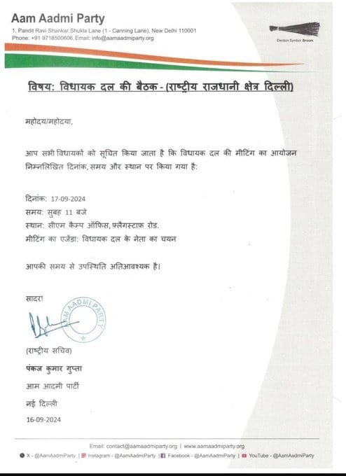 दिल्ली के नए सीएम के नाम पर मोहर लगाने के लिए 17 सितंबर को सीएम आवास पर आप विधायक की बैठक होने वाली है। इसके लिए आम आदमी पार्टी के राष्ट्रीय सचिव पंकज कुमार गुप्ता द्वारा प्रेस रिलीज जारी कर विधायको को आमंत्रित किया गया है।