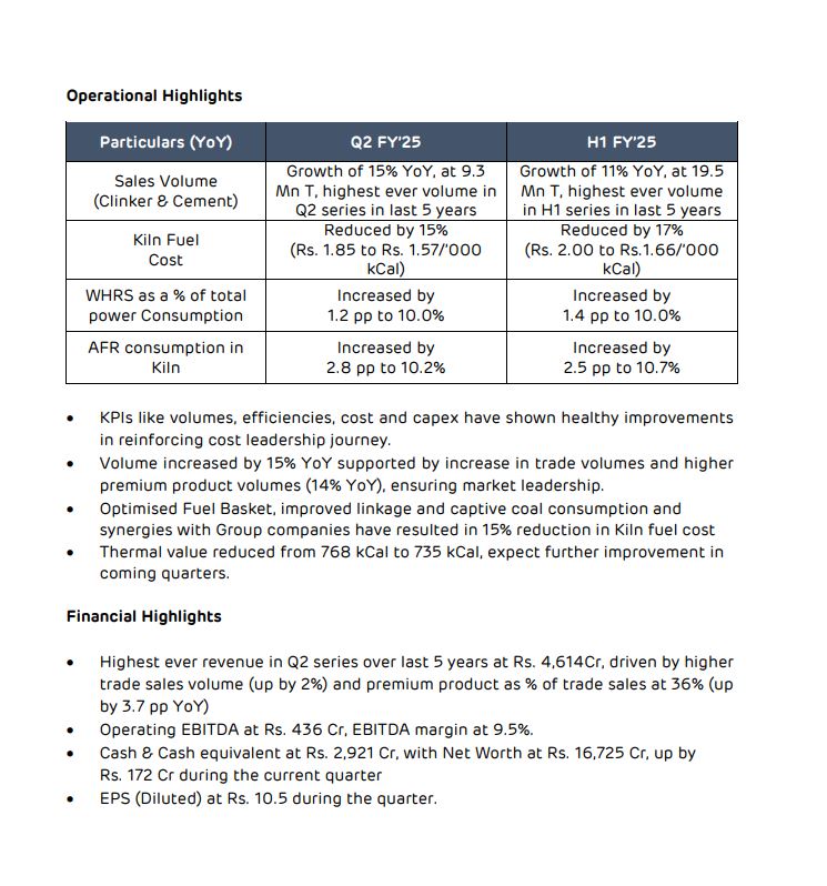 सीईओ अजय कपूर ने कहा कि दूसरी तिमाही में हमारा प्रदर्शन सीमेंट उद्योग में अग्रणी के रूप में हमारी स्थिति को मजबूत करता है।