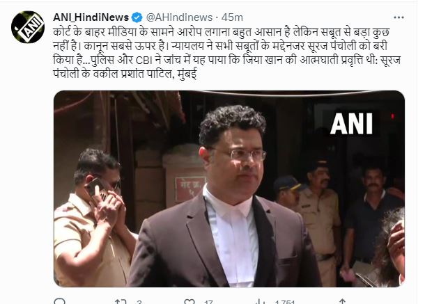 निर्णय आने के बाद कोर्ट के बाहर सूरज पंचोली के वकील प्रशांत पाटिल ने कहा कि मीडिया के सामने आरोप लगाना बहुत आसान है. लेकिन सबूत से बड़ा कुछ नहीं है. कानून सबसे ऊपर है. न्यायलय ने सभी सबूतों के मद्देनजर सूरज पंचोली को बरी किया है…पुलिस और CBI ने जांच में यह पाया कि जिया खान की आत्मघाती प्रवृत्ति थी.