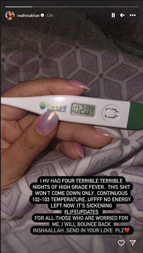 एक्ट्रेस ने अपनी स्वास्थ्य की जानकारी देते हुए अपने इंस्टाग्राम पर 2 स्टोरी शेयर की है जिसमें पहली स्टोरी में उन्होनें थर्मामीटर की फोटो डाला है जिसमें उनका बॉडी टंपरेचर 102 दिख रहा है । इस फोटो के कैप्शन में उन्होनें लिखा है ” मुझे तेज बुखार है जिसके चलते पिछली चार रातें मेरी बहुत खराब निकली । मेरा लगातार 102-103 बॉडी टेंपरेचर बना हुआ है। अब एनर्जी नहीं बची है। जो लोग मेरे लिए चिंतित हैं, उन्हें बता दूं कि मैं जल्द ही बाउंस बैक करूंगी।