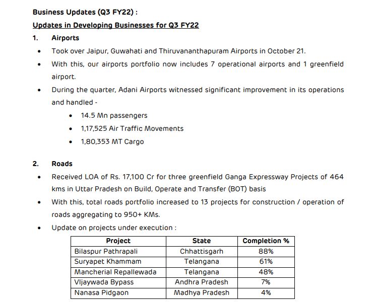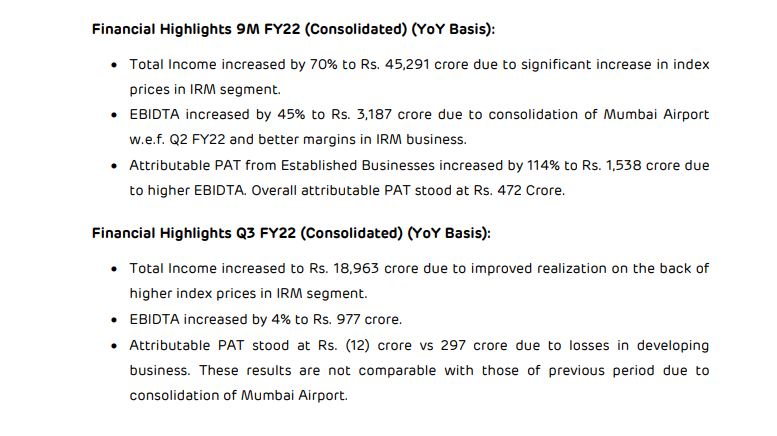 अडानी समूह के स्वामित्व वाली अदाणी एंटरप्राइजेज लिमिटेड ने 31 दिसंबर, 2021 को समाप्त 9 महीने और तिमाही के परिणामों की घोषणा की। वित्तवर्ष 2022 की तिमाही के लिए आईआरएम खंड में सूचकांक कीमतों में उल्लेखनीय वृद्धि के कारण कुल आय 70 प्रतिशत बढ़कर 45,291 करोड़ रुपये हो गई है। राजस्व में वृद्धि और आईआरएम कारोबार में बेहतर मार्जिन के कारण समेकित एबिटा 45 प्रतिशत बढ़कर 3187 करोड़ रुपये हो गया है।