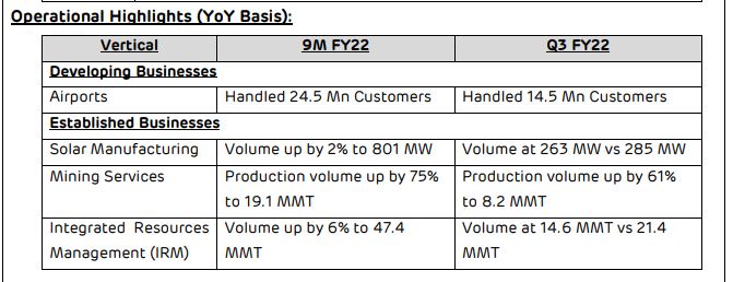 • एबिटा 45% बढ़कर रु. मुंबई एयरपोर्ट के चकबंदी से 3,187 करोड़ प्रभावी कार्य दिवस Q2 FY22 और IRM व्यवसाय में बेहतर मार्जिन।