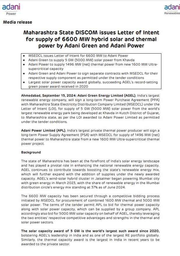 एमएसईडीसीएल द्वारा संयुक्त रूप से 1600 मेगावाट तापीय और 5000 मेगावाट सौर ऊर्जा की खरीद के लिए शुरू की गई प्रतिस्पर्धी बोली प्रक्रिया के माध्यम से 6600 मेगावाट क्षमता हासिल की गई है। निविदा की शर्तें एपीएल को सौर ऊर्जा क्षमता के साथ-साथ तापीय बिजली क्षमता के लिए बोली लगाने की अनुमति देती हैं, जिसे समूह की एक कंपनी द्वारा आपूर्ति की जा सकती है। एपीएल ने तदनुसार एजीईएल की ओर से 5000 मेगावाट सौर क्षमता के लिए भी बोली लगाई, जिससे तापीय और सौर ऊर्जा क्षेत्रों में दोनों संस्थाओं के संबंधित प्रतिस्पर्धी लाभ और ताकत का लाभ उठाया जा सके।