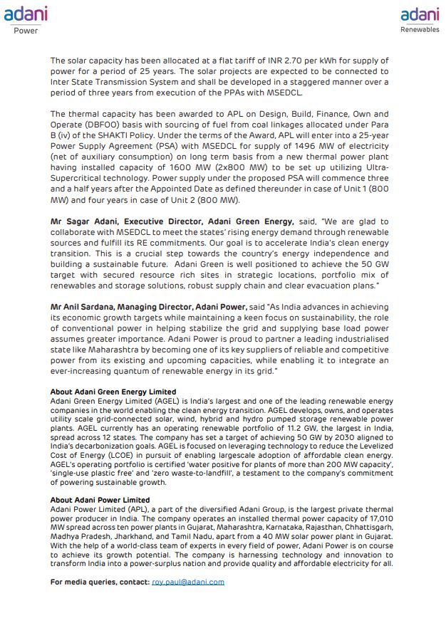 भारत की सबसे बड़ी निजी ताप विद्युत उत्पादक कंपनी अदाणी पावर लिमिटेड (एपीएल) एक नई 1600 मेगावाट अल्ट्रा-सुपरक्रिटिकल ताप विद्युत परियोजना से महाराष्ट्र राज्य को 1496 मेगावाट (शुद्ध) ताप विद्युत की आपूर्ति के लिए एमएसईडीसीएल के साथ दीर्घकालिक विद्युत आपूर्ति समझौते (पीएसए) पर हस्ताक्षर करेगी।