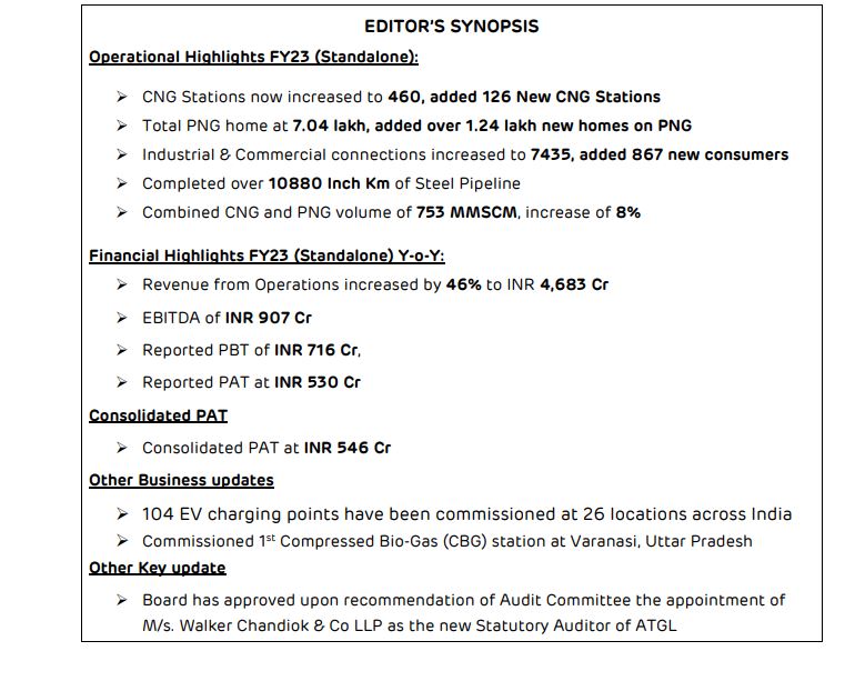 “एटीजीएल ने लचीलापन दिखाया है और पूरे साल उच्च गैस की कीमतों के बावजूद भौतिक बुनियादी ढांचे और वित्तीय मोर्चे दोनों पर अच्छा प्रदर्शन किया है। स्टील पाइपलाइन और सीएनजी स्टेशनों के फास्ट-ट्रैक विकास ने उन भौगोलिक क्षेत्रों में प्राकृतिक गैस पारिस्थितिकी तंत्र बनाने में मदद की है जहां हम मौजूद हैं और अब आगे चलकर पीएनजी उपभोक्ताओं को जोड़ने में मदद करेंगे।