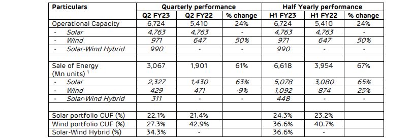 उच्च गुणवत्ता वाली एसबी ऊर्जा के एकीकरण के साथ सौर सीयूएफ और ऊर्जा की बिक्री में सुधार हुआ है। वित्त वर्ष 2013 की पहली छमाही में 26.3% सीयूएफ वाला पोर्टफोलियो। समग्र पवन पोर्टफोलियो सीयूएफ में कमी और ऊर्जा की बिक्री मुख्य रूप से ट्रांसमिशन लाइन में एकतरफा व्यवधान के कारण होती है। गुजरात में 150 मेगावाट के संयंत्र के लिए Q2 FY23 में इस घटना के प्रभाव की उम्मीद है। समग्र परिचालन क्षमता के अपेक्षित वार्षिक उत्पादन का 0.4% के सिवा पूर्वोक्त 150 मेगावाट संयंत्र, पवन पोर्टफोलियो सीयूएफ वित्त वर्ष 2013 की पहली छमाही में 41.0% की मजबूत स्थिति में है।