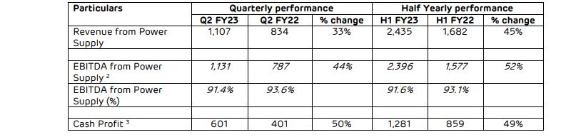 - बिजली आपूर्ति से EBITDA उच्च EBITDA मार्जिन के साथ सालाना 52% बढ़कर 2,396 करोड़ रुपये हो गया।