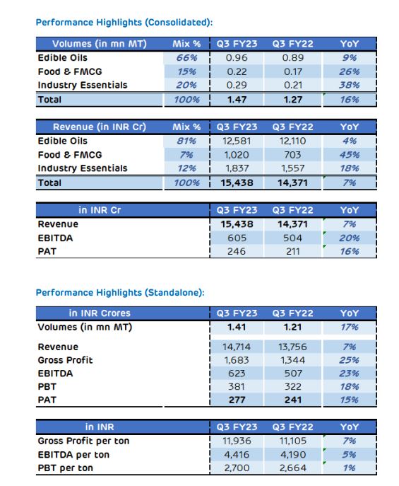 विनियामक फाइलिंग के अनुसार, अडानी विल्मर ने खाद्य तेल की मात्रा में उच्च-एकल-अंक की वृद्धि दर्ज की, जबकि विकास Q3FY23 में मूल्य के संदर्भ में कम-एक अंक में था।अडानी विल्मर ने कहा, “वर्ष के दौरान अस्थिर खाद्य तेल की कीमतों के माहौल में, हम लोकप्रिय और प्रीमियम ब्रांडों के अपने पोर्टफोलियो के साथ मांग पर कब्जा करने में सक्षम रहे हैं.”