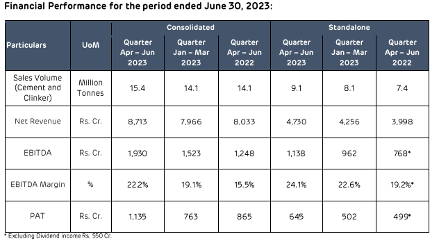विविधीकृत अडानी समूह की सीमेंट और भवन निर्माण सामग्री कंपनी अंबुजा सीमेंट्स ने आज 30 जून, 2023 को समाप्त तिमाही के लिए वित्तीय परिणामों की घोषणा की।