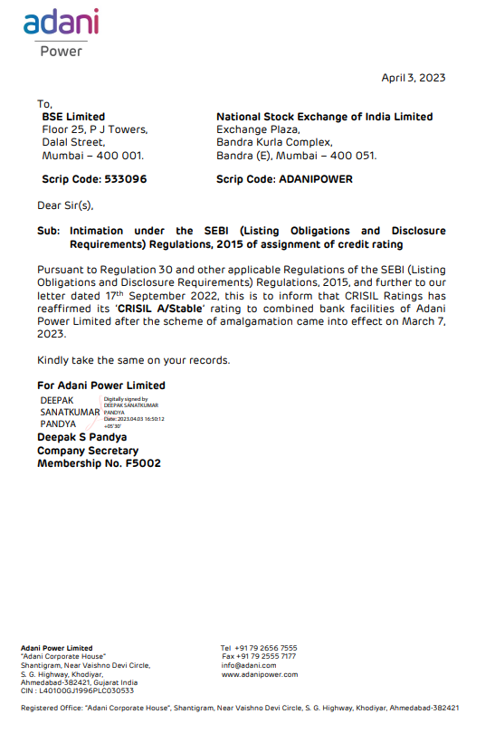 सोमवार को अडानी समूह ने बॉम्बे स्टॉक एक्सचेंज लिमिटेड और नेशनल स्टॉक एक्सचेंज ऑफ इंडिया लिमिटेड को पत्राचार कर एक अहम सूचना दी. अडानी समूह ने BSE और NSE को 7 मार्च, 2023 को समामेलन की योजना लागू होने के बाद अडानी पावर लिमिटेड की संयुक्त बैंक सुविधाओं से संबंधित ग्लोबल रेटिंग एजेंसी क्रिसील की ताजा रेटिंग्स से सूचित किया.
