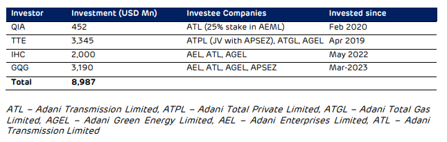 रणनीतिक दीर्घकालिक निवेशकों की भागीदारी को सक्षम करने के समूह के पूंजी प्रबंधन दर्शन के अनुरूप, अडानी ने कतर इन्वेस्टमेंट अथॉरिटी (QIA), टोटल एनर्जीज (TTE), इंटरनेशनल होल्डिंग कंपनी (IHC) के साथ-साथ बड़े पैमाने पर निवेश को आकर्षित किया है. इनके अलावा GQG पार्टनर्स (GQG) अपने सह-निवेशकों ऑस्ट्रेलिया सुपर, गोल्डमैन सैक्स, टेक्सास विश्वविद्यालय, डेलावेयर पब्लिक एम्प्लॉइज रिटायरमेंट सिस्टम, मास्टर ट्रस्ट बैंक ऑफ जापान, मिसौरी एजुकेशन पेंशन ट्रस्ट, अबू धाबी इन्वेस्टमेंट अथॉरिटी, यूनिवर्सल इन्वेस्टमेंट लक्ज़मबर्ग, न्यूयॉर्क स्टेट के साथ टेक्सास का सामान्य सेवानिवृत्ति कोष और कर्मचारी सेवानिवृत्ति प्रणाली के साथ बड़े पैमाने पर निवेश को आकर्षित किया है.