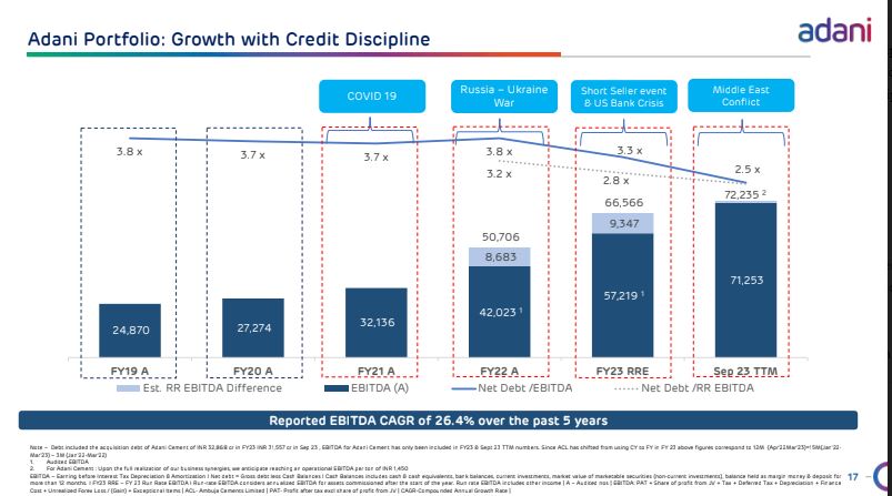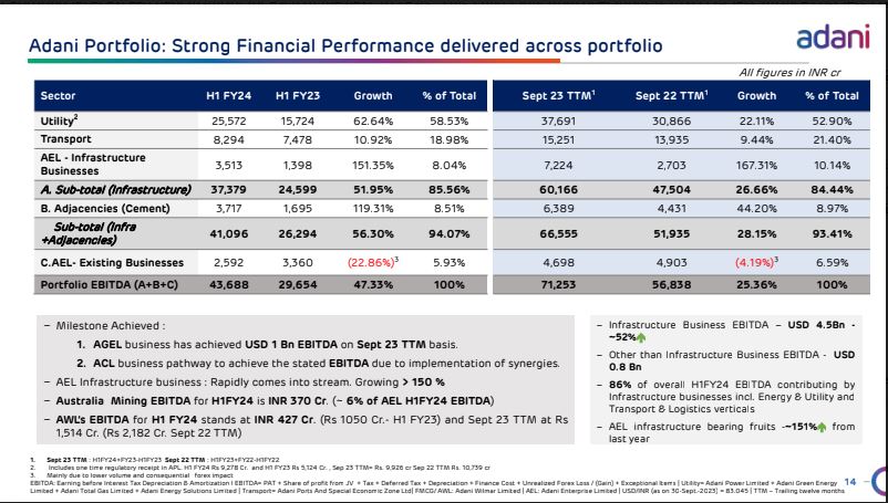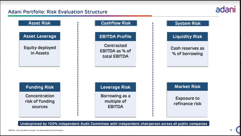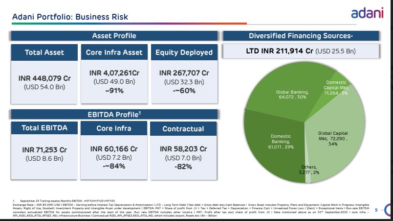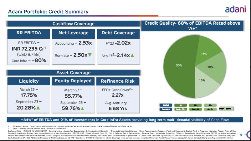 उल्लेखनीय रूप से, EBITDA का 80% से अधिक है.संविदात्मक और EBITDA का 68% A+ रेटेड है, इस प्रकार उच्चतम स्तर की स्थिरता और बहु-दशकीय प्रदान करता है. नकदी प्रवाह दृश्यता. जैसा कि परिलक्षित होता है. इस मजबूत नकदी प्रवाह ने अनियंत्रित निवेश की अनुमति दी है और परिसंपत्ति आधार बढ़कर 4.48 लाख करोड़ रुपये (54 बिलियन अमेरिकी डॉलर) हो गया है. इक्विटी परिनियोजन कुल का 59.8% है संपत्ति का आधार, उद्योग मानकों से कहीं अधिक है। अडानी पोर्टफोलियो विश्वस्तरीय निर्माण के लिए प्रतिबद्ध है.अपने मजबूत क्रेडिट प्रोफाइल को और बढ़ाते हुए वित्त वर्ष 2024 की पहली छमाही में अडानी कंपनियों के पोर्टफोलियो ने मजबूत वित्तीय प्रदर्शन किया है.