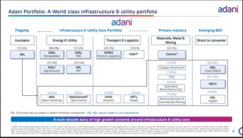 अडानी पोर्टफोलियो विविधीकृत पोर्टफोलियो का सबसे बड़ा और सबसे तेजी से बढ़ने वाला पोर्टफोलियो है.भारत में लॉजिस्टिक्स (बंदरगाह, हवाई अड्डे, लॉजिस्टिक्स, शिपिंग और रेल), संसाधन, बिजली में रुचि रखने वाले व्यवसाय उत्पादन और वितरण, नवीकरणीय ऊर्जा, गैस और बुनियादी ढांचा, कृषि (वस्तुएं, खाद्य तेल, भोजन उत्पाद, कोल्ड स्टोरेज और अनाज साइलो), रियल एस्टेट, सार्वजनिक परिवहन अवसंरचना, उपभोक्ता वित्त और रक्षा, और अन्य क्षेत्र।अडानी की सफलता और नेतृत्व की स्थिति का श्रेय उसके ‘राष्ट्र निर्माण’ के मूल दर्शन को जाता है और ‘अच्छाई के साथ विकास’ – सतत विकास के लिए एक मार्गदर्शक सिद्धांत समूह की सुरक्षा के लिए प्रतिबद्ध है.अधिक जानकारी www.adani.com पर लॉगिन करें।