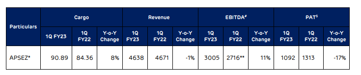Q1FY23 के दौरान, समेकित EBITDA (गंगावरम को छोड़कर) बंदरगाहों और रसद व्यवसाय के लिए राजस्व वृद्धि के पीछे 11% बढ़कर ₹ 3,005 करोड़ हो गया। विशेष रूप से, पोर्ट राजस्व में वृद्धि के कारण कंपनी का पोर्ट्स EBITDA 18% बढ़कर ₹ 2,885 करोड़ हो गया। जबकि लॉजिस्टिक्स व्यवसाय EBIDTA 56% बढ़कर ₹96 करोड़ हो गया और मार्जिन 370 बीपीएस बढ़कर 27% हो गया। यह कार्गो की मात्रा में वृद्धि, कार्गो विविधीकरण, घाटे में चल रहे मार्गों को समाप्त करने और परिचालन दक्षता उपायों से सहायता प्राप्त थी।