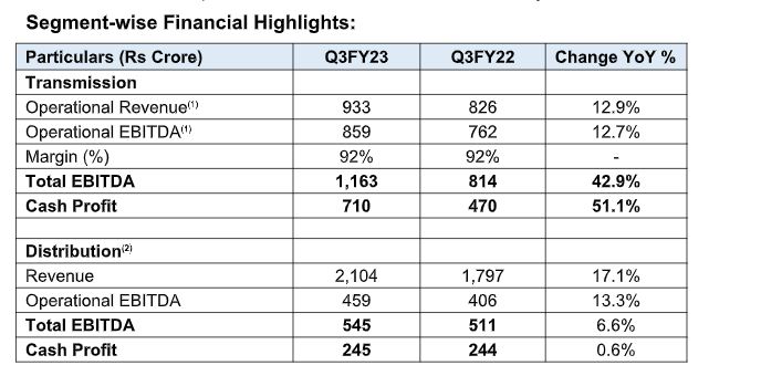 Q3FY23 में, 478 करोड़ रुपये का समेकित PAT YoY से 73% अधिक था। वृद्धि मुख्य रूप से थी विनियामक आदेश से एकमुश्त आय द्वारा संचालित