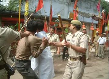 पूर्व भाजपा विधायक सलिल बिश्नोई के ऊपर लाठीचार्ज करती पुलिस