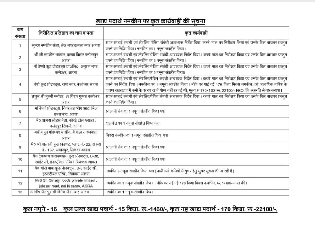 इसमें अनुराग नगर के बल्केश्वर स्थित मां वैष्णो फूड प्रोडक्ट्स, बल्केश्वर बंशी फूड प्रोडक्ट्स, ठाकुर श्री मुरली मनोहर फूड प्रोडक्ट्स,भोले बाबा फूड प्रोडक्ट्स पर कार्रवाई की गई.. इसके साथ ही बाह स्थित आशीष जैन फूड प्रोडक्ट्स पर भी छापेमारी हुई, जहां 16 किलोग्राम नमकीन के सैंपल एकत्र किए गए और 15 किलोग्राम नमकीन को जब्त भी किया गया। FSDA की इस कार्रवाई से खाद्य सुरक्षा के मानकों को सुनिश्चित करने और ग्राहकों को सुरक्षित खाद्य पदार्थ उपलब्ध कराने का प्रयास किया गया है।