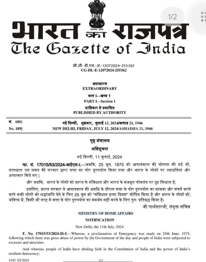 केंद्र सरकार की तरफ से जारी की गई अधिसूचना के तहत, “25 जून 1975 को Emergency की घोषणा की गई थी, उस समय की सरकार ने सत्ता का घोर दुरुपयोग किया था और भारत के लोगों पर अत्याचार किये थे। जबकि भारत के लोगों को देश के संविधान और भारत के मजबूत लोकतंत्र पर दृढ़ विश्वास है। इसलिए भारत सरकार ने आपातकाल की अवधि के दौरान सत्ता के घोर दुरुपयोग का सामना और संघर्ष करने वाले सभी लोगों को श्रद्धांजलि देने के लिए 25 जून को “संविधान हत्या दिवस” घोषित किया है और भारत के लोगों को, भविष्य में, किसी भी तरह से सत्ता के घोर दुरुपयोग का समर्थन नहीं करने के लिए पुनः प्रतिबद्ध किया है।
