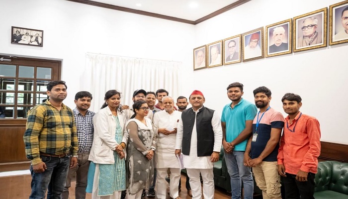 समाजवादी पार्टी के राष्ट्रीय अध्यक्ष और पूर्व मुख्यमंत्री अखिलेश यादव से मंगलवार को संयुक्त स्वास्थ्य आउटसोर्सिंग/संविदा कर्मचारी संघ के प्रतिनिधिमंडल ने मुलाकात की. इस दौरान उन्होंने आउटसोर्स से रखे गए कोविड कर्मचारियों को एन.आर.एच.एम. उत्तर प्रदेश में समायोजित कर स्थायीकरण करने की मांग को लेकर ज्ञापन सौंपा. साथ ही उन्हें जनपदों मे बन रहे मेडिकल कॉलेज से संबद्ध कराने की मांग की.