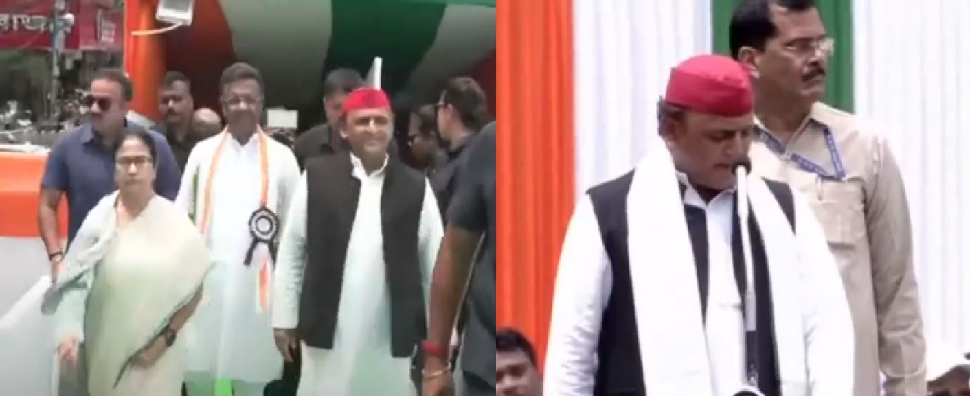 कोलकाता- कोलकाता में टीएमसी के शहीद दिवस कार्यक्रम के लिए धर्मतला में मंच सज कर तैयार हो गया. इस बार ममता बनर्जी के साथ मंच पर समाजवादी पार्टी के अध्यक्ष अखिलेश यादव भी शामिल हुए. टीएमसी की रैली में अखिलेश यादव ने जनता को संबोधिति किया.