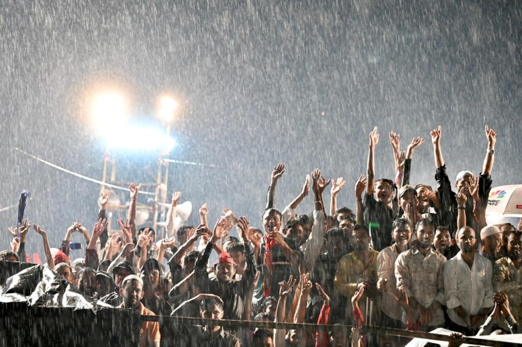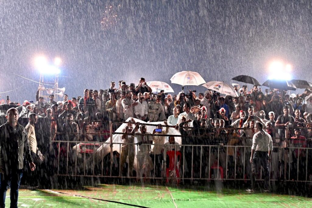जनसभा के दौरान भारी वर्षा के बावजूद बड़ी संख्या में लोग उपस्थित रहे।