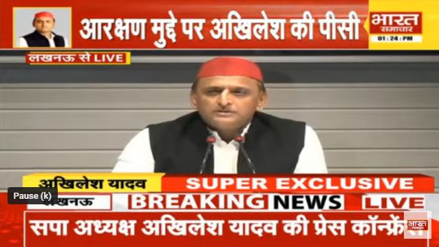 बृहस्पतिवार को समाजवादी पार्टी के राष्ट्रीय अध्यक्ष अखिलेश यादव ने प्रेस कांफ्रेंस कर भारतीय जनता पार्टी को आरक्षण सहित कई मुद्दों पर घेरते हुए तीखा प्रहार किया। उन्होंने बीजेपी को पिछड़ा विरोधी बताते हुए कहा कि उसका व्यवहार हमेशा से ही पिछड़ों के लिए सौतेला रहा हैं। इन दिनों तो मैं देख रहा हूँ दलितों,पिछड़ों के प्रति सौतेला व्यवहार कर रही हैं साथ उनके उनके अधिकारों को भी खत्म किया जा रहा हैं।
