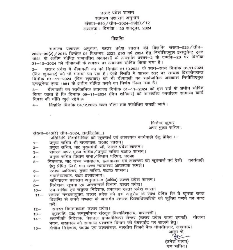 बता दें उत्तर प्रदेश सरकार ने दिपावली के मौके पर 31 तारीख के साथ-साथ अब 1 को भी अवकाश घोषित कर दिया है। बता दें इसके पहले 31 के अलावा 2 तारीख को भाई दूज के मौके पर छुट्टी थी। लेकिन अब सरकार ने ऐलान किया है कि 1 तारीख को भी छुट्टी रहेगी। अब 31,1 और 2 तारीख लगातार तीन दिनों तक छुट्टी रहेगी। माना जा रहा है सरकार का ये फैसला त्योहार की वजह से लिया गया है।
