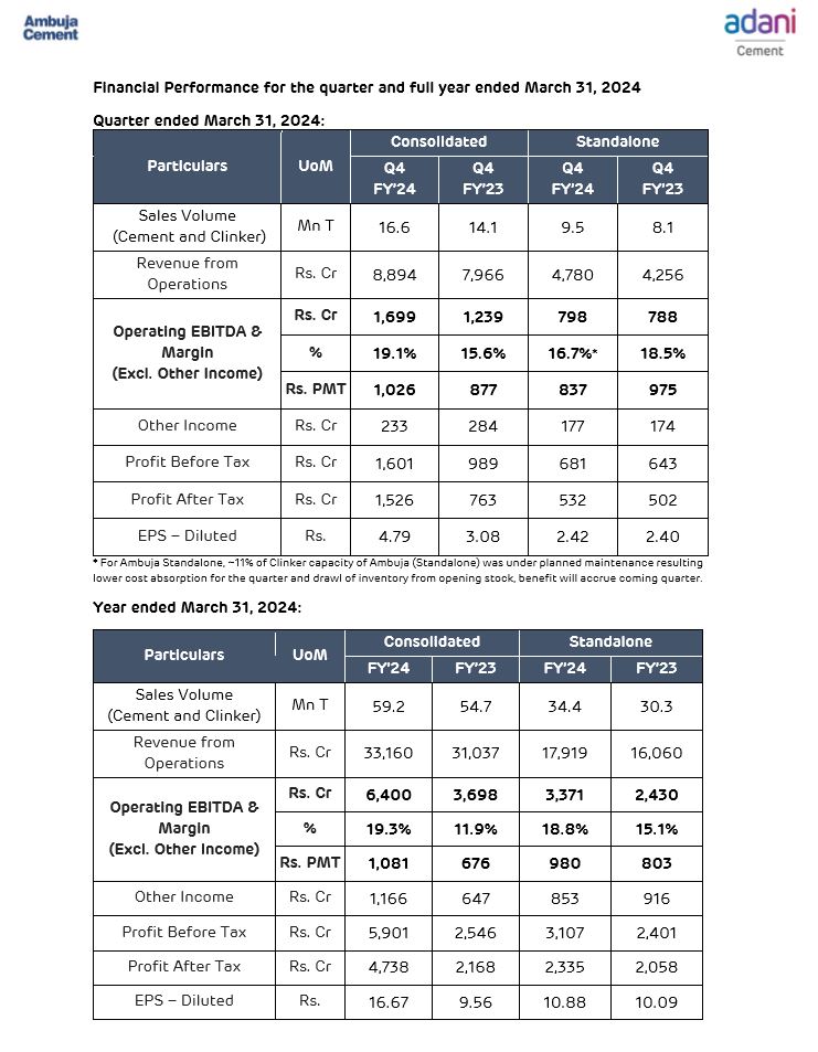 अहमदाबाद. अडानी समूह की प्रमुख सीमेंट और निर्माण सामग्री कंपनी अंबुजा सीमेंट्स ने आज 31 मार्च 2024 को समाप्त तिमाही और पूरे वर्ष के लिए रिकॉर्ड-सेटिंग स्टैंडअलोन और समेकित वित्तीय परिणामों की घोषणा की। यह मजबूत प्रदर्शन बेहतर प्रदर्शन से प्रेरित है।