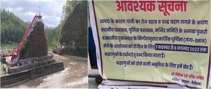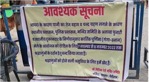 रामनगर: हर वर्ष कार्तिक पूर्णिमा के अवसर पर प्रसिद्ध गर्जिया मंदिर में गंगा स्नान के लिए सुबह से ही श्रद्धालुओं की भारी भीड़ उमड़ती है। सुबह से ही गर्जिया मंदिर के पास स्थित कोसी नदी पर श्रद्धालुओं की भारी भीड़ स्नान के लिए जुटती है। वहीं आज सुबह से ही कार्तिक पूर्णिमा पर गर्जिया मंदिर में स्नान के लिए दूर दराज से आने वाले भक्तो की भीड़ उमड़ना शुरू हो गयी थी, पर मन्दिर समिति व स्थानीय प्रशासन द्वारा मंदिर में स्नान व भक्तों के दर्शन के लिए कोसी नदी का जलस्तर बढ़ा होने से सुरक्षा के दृष्टिगत मंदिर में भक्तों का प्रवेश प्रतिबंधित किया गया था।