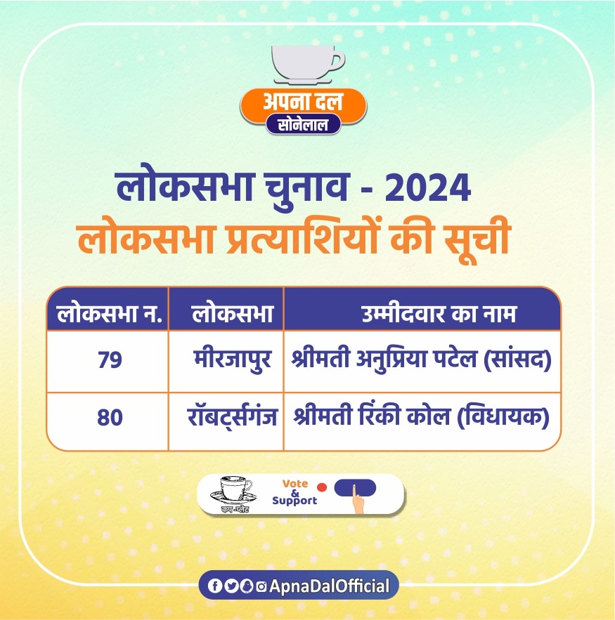 पार्टी के तरफ से जारी लिस्ट के तहत इस लोकसभा चुनाव में अनुप्रिया पटेल मिर्जापुर से मोर्चा संभालेंगी। वहीं, पार्टी के तरफ से रिंकी कोल को राबर्ट्सगंज से प्रत्याशी बनाया गया है।