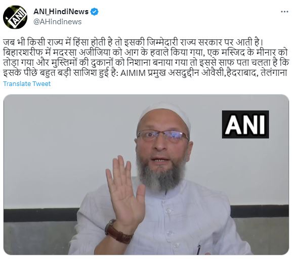 असदुद्दीन ओवैसी ने कहा कि बिहार के मुख्यमंत्री नीतीश कुमार और उपमुख्यमंत्री तेजस्वी यादव को मालूम था कि नालंदा एक संवेदनशील जिला है, फिर भी ये हुआ. तो ये जो भी कुछ बिहार में हुआ उसकी जिम्मेदारी बिहार सरकार पर आती है. उन्हें मालूम था कि वहां हिंसा हो सकती है, क्योंकि 2016 में भी इस तरह की हिंसा नालंदा में हुई थी.