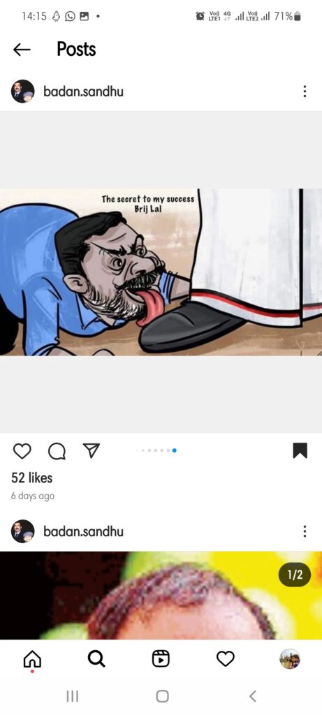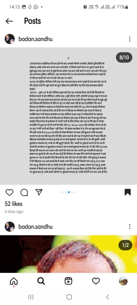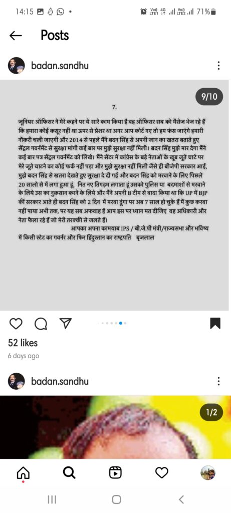 पूर्व आईपीएस अधिकारी और बीजेपी नेता बृजलाल के खिलाफ बदन सिंह बद्दो हमेशा ऊलजलूल लिखता रहता है। 6 दिन पहले बदन सिंह बद्दो ने जो 10 तस्वीरें पोस्ट की हैं वह पूर्व आईपीएस बृजलाल की किताब “पुलिस की बारात” के एडिटेड पन्ने हैं। बदन सिंह बद्दो यहां कहना चाहता है कि इस किताब में बृजलाल में अपने बारे में काफी कसीदे लिखे हैं लेकिन सच्चाई यह है जो वह पोस्ट कर रहा है। इस किताब को इस तरीके से लिखा जाना चाहिए था।