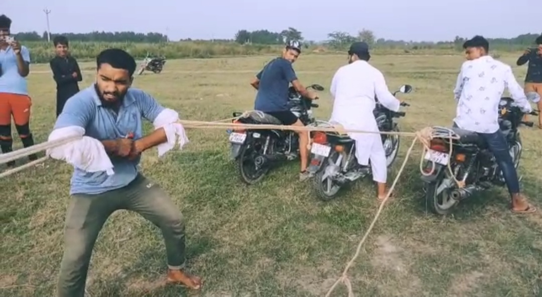 उत्तर प्रदेश के जनपद बागपत में एक बाहुबली का वीडियो शोसल मीडिया पर वायरल हो रही हैं। बहुबली युवक का मोटरसाइकलों के साथ स्टंट करते हुए वीडियो वायरल हो रहा हैं। वायरल वीडियो में बहुबली युवक अपनी दोनों बाजुओं में 6 बाईको को बांधकर मोटर साइकलों को खिंचते हुए नजर आ रहा हैं। लेकिन 6 मोटर साइकलें भी बहुबली युवक को अपनी जगह से हिला न सकी। अपनी ताकत दिखाने के लिए युवक ने 3 मोटर साइकलें में एक हाथ की तरफ रस्सी बांधी और 3 मोटर साइकलें में दूसरे हाथ की तरफ रस्सी बांधी, और मोटर साइकलें में बंधी रस्सी को हाथों में जकडने के बाद युवक ने उल्टी डायरेक्शन में खींचवाया, लेकिन मोटर साइकिल सवार पूरी ताकत लगाने के बाद भी बहुबली युवक को अपनी जंगह से हिला न सकी। स्टंट करते युवक का वीडियो सोशल मीडिया पर जमकर वायरल हो रहा है। कोई बहुबली युवक की तारीफ कर रहा है तो कोई इस स्टंट को जानलेवा बता रहा है।