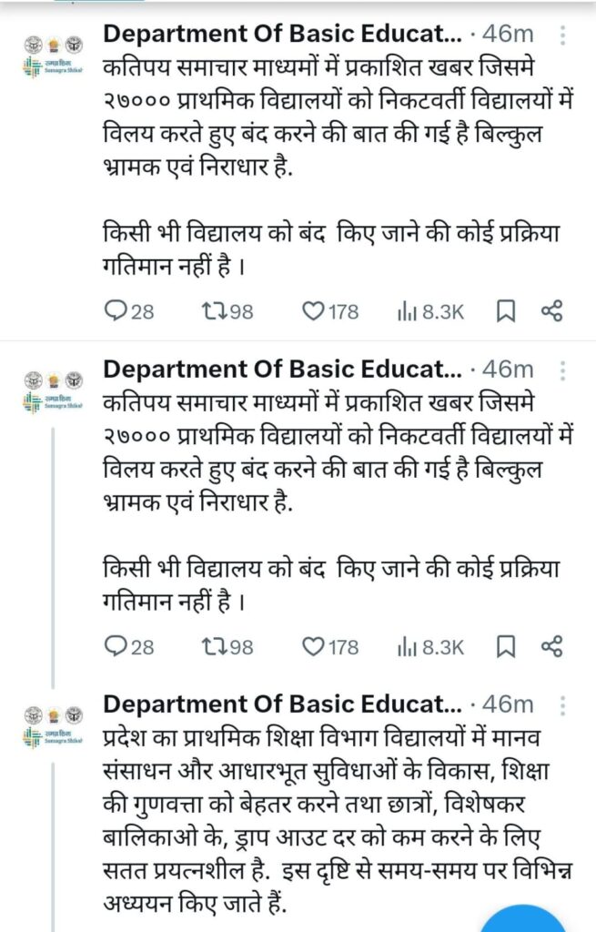 इसके बाद जब भारत समाचार ने इस मुद्दे को उठाते हुए खबर चलाई तो शिक्षा विभाग के वरिष्ठ अधिकारी इस बात के खंडन करने लगे.. और शिक्षा विभाग के ऑफिशियल एक्स अकाउंट पर लिखा कि, कतिपय समाचार माध्यमों में प्रकाशित खबर जिसमे 2700 प्राथमिक विद्यालयों को निकटवर्ती विद्यालयों में विलय करते हुए बंद करने की बात की गई है बिल्कुल भ्रामक एवं निराधार है. किसी भी विद्यालय को बंद किए जाने की कोई प्रक्रिया गतिमान नहीं है।