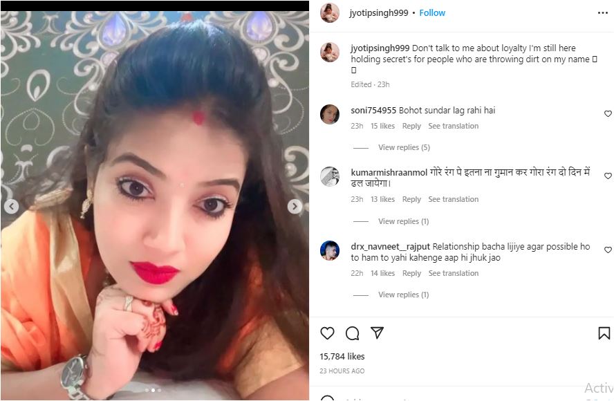 पवन सिंह की दूसरी पत्नी ज्योति सिंह ने इंस्टाग्राम अकाउंट पर लेटेस्ट फोटोज शेयर की है, जिसमें उन्हें मांग में सिंदूर लगाए और श्रृंगार किए हुए देखा जा सकता है. उन्होंने न केवल फोटो पोस्ट की है बल्कि कैप्शन भी धमाकेदार लिखा है. उन्होंने लिखा है कि ‘ईमानदारी के बारे में मुझे बात मत कीजिए, मैंने आज भी कई सीक्रेट्स छुपाए हैं उन लोगों के जो मेरे नाम पर गंद फैला रहे हैं’. उनकी इस पोस्ट पर लोगों के भी रिएक्शन्स देखने के लिए मिले हैं.