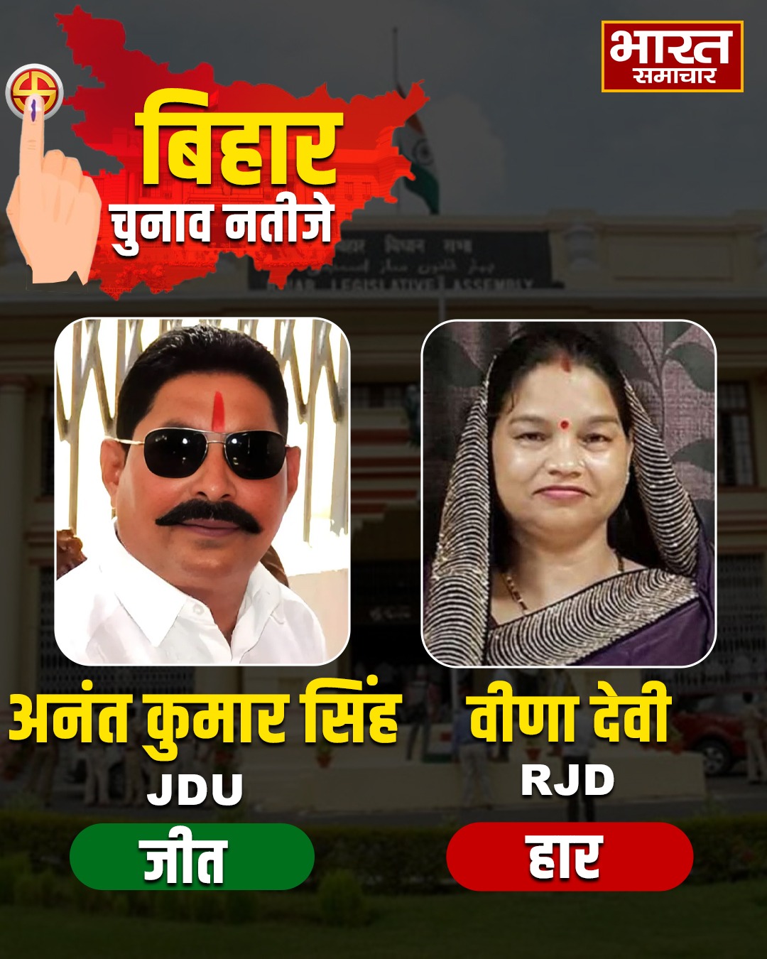 बिहार की हाई-प्रोफाइल मोकामा सीट पर जदयू उम्मीदवार अनंत कुमार सिंह ने एक बड़ी और ऐतिहासिक जीत दर्ज की है। उन्होंने RJD प्रत्याशी वीना देवी को बड़े अंतर से हराया, जो इस चुनाव में एक बेहद दिलचस्प मुकाबला था। अनंत सिंह शुरू से ही बढ़त बनाए हुए थे और अंत तक यह बढ़त लगातार मजबूत होती रही।
