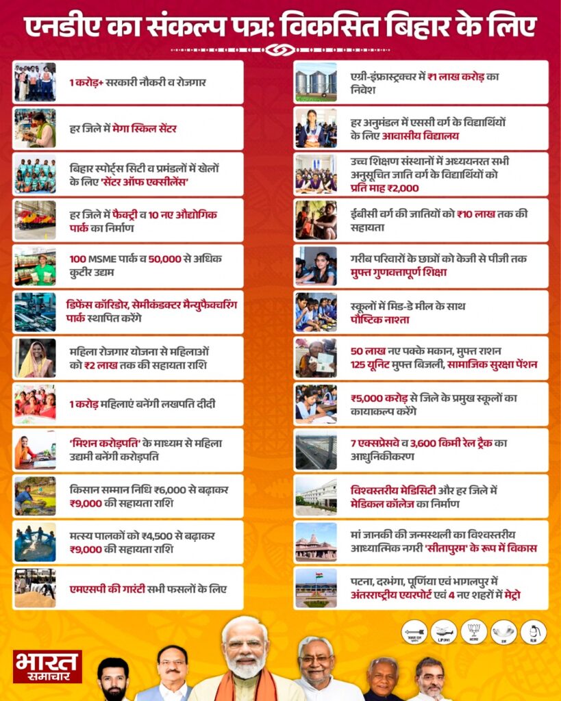 बिहार विधानसभा चुनाव 2025 के लिए राष्ट्रीय जनतांत्रिक गठबंधन (NDA) ने अपना घोषणापत्र जारी किया। इस अवसर पर बीजेपी अध्यक्ष जे पी नड्डा और मुख्यमंत्री नीतीश कुमार समेत सहयोगी पार्टियों के नेता भी उपस्थित रहे। एनडीए का घोषणापत्र रोजगार, महिला सशक्तिकरण और कृषि विकास पर बड़ा जोर देता है।