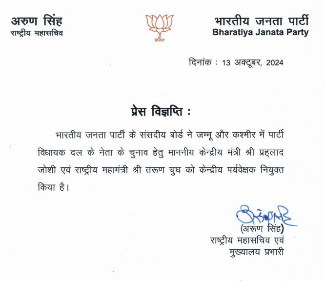 हरियाणा के साथ जम्मू-कश्मीर में भी विधायक दल का नेता चुनने के लिए बीजेपी ने पर्यवेक्षकों की नियुक्ति की है। इस दौरान पार्टी ने केंद्रीय मंत्री प्रह्लाद जोशी और तरुण चुग को जिम्मेदारी दी है। आपको बता दें अनुच्छेद 370 हटने के बाद यह प्रदेश में यह पहला विधानसभा चुनाव था। जिसमें बीजेपी दूसरी सबसे बड़ी पार्टी रही। 90 विधानसभा वाली जम्मू-कश्मीर में बीजेपी ने 29 सीटें जीतीं। लेकिन सरकार बनाने में नेशनल कान्फ्रेंस और कांग्रेस गठबंधन कामयाब रही।