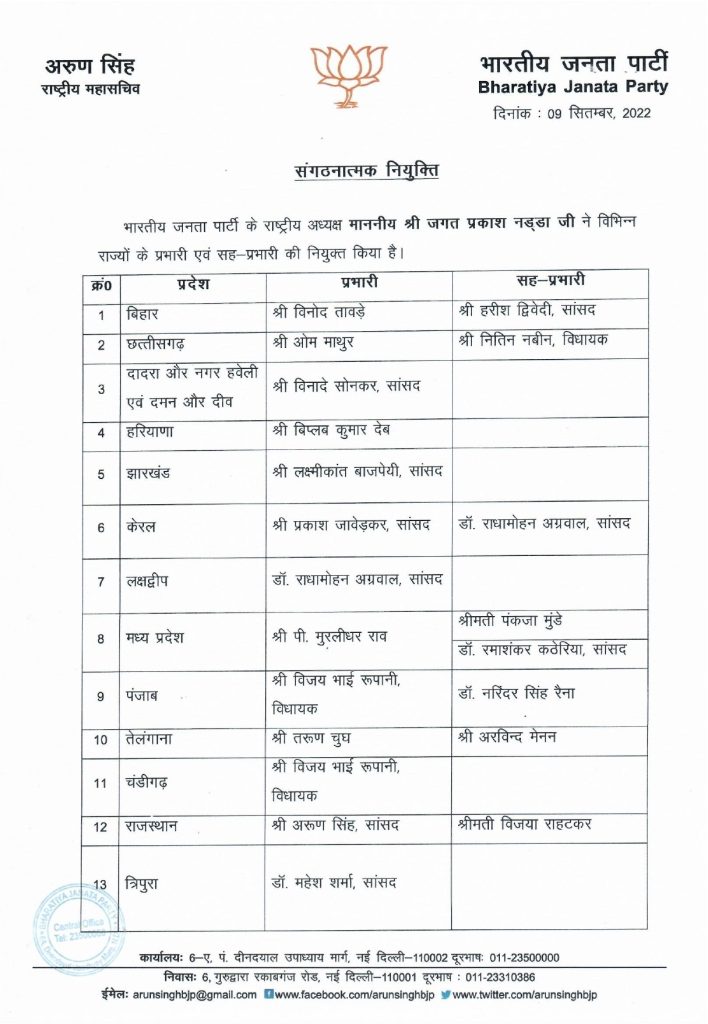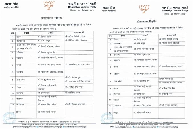 - विनोद सोनकर दमन दीव,दादरा और नगर हवेली के प्रभारी