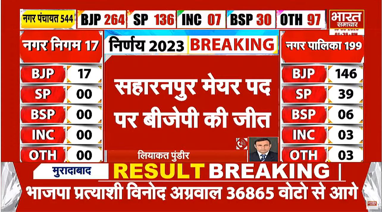 आपको बतादें कि उत्तर प्रदेश के नगर निकाय चुनाव और विधानसभा में उपचुनाव के लिए मतगणना जारी हैं। जिसके लिए 4 मई व 11 मई को नगर निकाय चुनाव के दो चरणों के लिए मतदान कराया गया था। अब तक आए रुझानों के मुताबिक बीजेपी का नगर निगम में दबदबा दिख रहा है। नगर निगम की सभी सीटों पर बीजेपी आगे चल रही हैं। अब तक के रुझानों में बीजेपी ने सपा-बसपा को पीछे छोड़कर काफी बढ़त बना ली है। सहारनपुर मेयर पद पर बीजेपी ने जीत हासिल कर ली है।