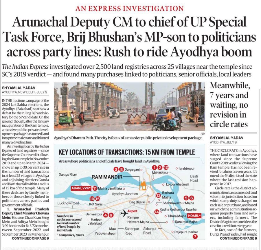 दरअसल, मंगलवार यानी 9 जुलाई को इंडियन एक्सप्रेस ने अयोध्या पर एक रिपोर्ट जारी करते हुए भारतीय जनता पार्टी पर बड़ा खुलासा किया था। जिसके तहत अरुणाचल प्रदेश के डिप्टी सीएम से लेकर बृजभूषण शरण सिंह के सांसद पुत्र और यूपी एसटीएफ के प्रमुख से लेकर अडाणी व लोधा जैसे ग्रुप जैसे दिग्गज अयोध्या में इन्वेस्टमेंट के लिए लाइन में लगे हुए हैं। इस खुलासे के बाद विपक्षी दलों ने बीजेपी के खिलाफ मोर्चा खोल दिया। इसी क्रम में सपा प्रमुख अखिलेश यादव भी जुड़ गए हैं।