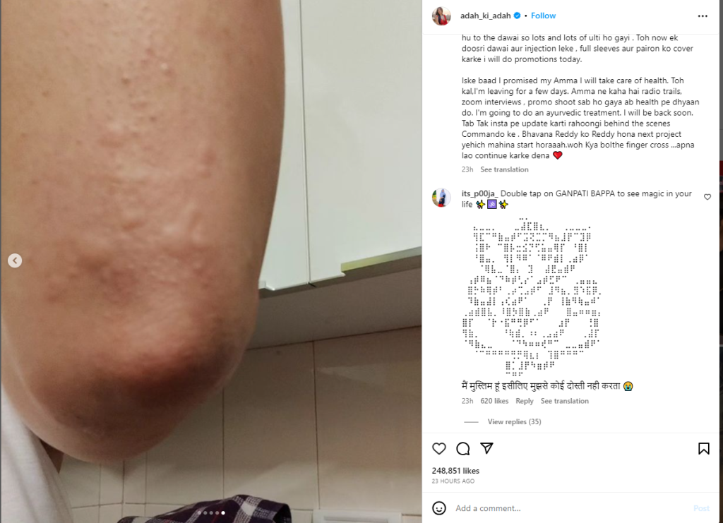 अदा ने अपने हाथ की फोटो शेयक करते हुए लिखा, ”भयंकर रैश है, जिसे मैं पूरी बाजू के कपड़े पहन छिपा रही थी लेकिन यह स्ट्रेस की वजह से मेरे चेहरे पर दिखने लगा है। इसके लिए मैंने दवाई ली और मैं दवाई के लिए एलर्जिक निकली तो उससे मेरी तबीयत और बिगड़ गई, तो मैं अब दूसरी दवाई और इंजेक्शन ले रही हूं। मैं आज प्रमोशन्स करुंगी लेकिन पूरी बाजू पहनकर।”आपको बता दें कि अदा शर्मा वेब सीरीज ‘कमांडो’ में नजर आएंगी। यह फिल्म डिज्नी प्लस हॉटस्टार पर 11 अगस्त को रिलीज होगी।
