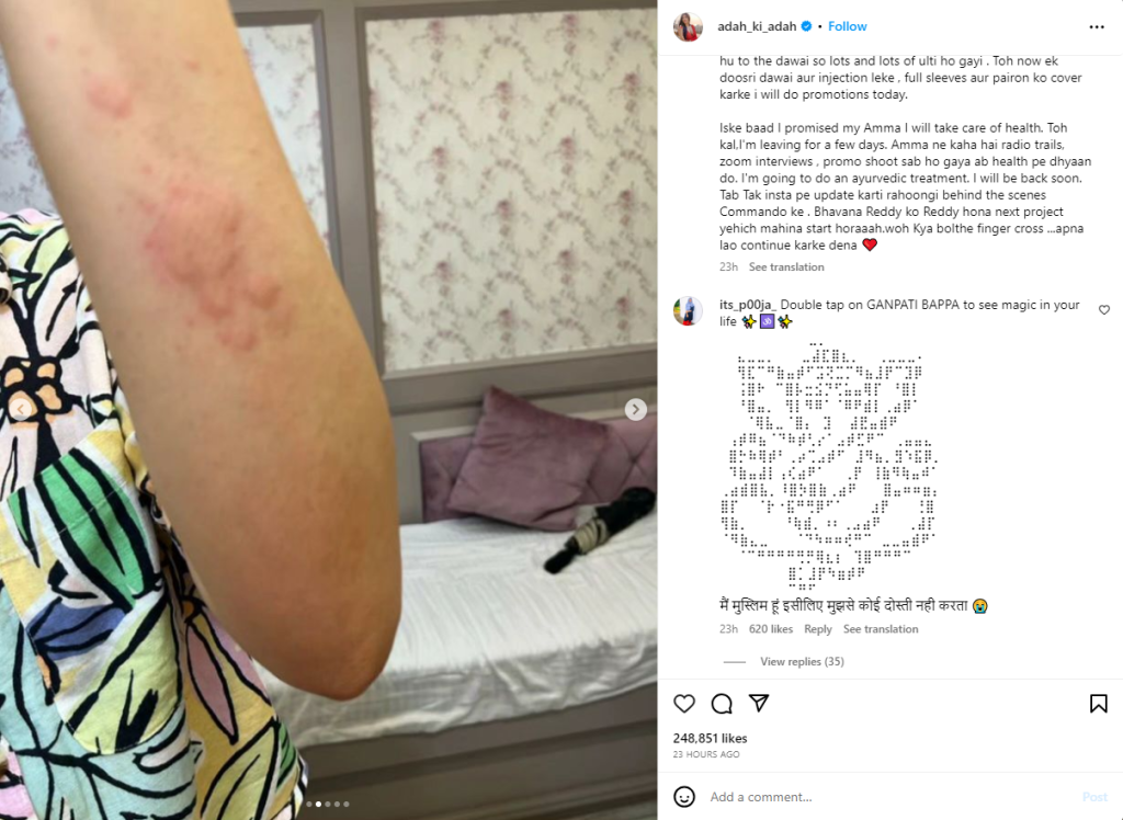 एक्ट्रेस की कुछ दिनों पहले फूड एलर्जी को लेकर अस्पताल में एडमिट होने की खबरें वायरल हो रही थीं। अदा शर्मा ने अब इन खबरों को कन्फर्म किया है। उन्होंने अपनी कुछ तस्वीरें शेयर की हैं, जिसमें उन्होंने हाथ पर उछले हीव्स यानि की पित्ती की फोटोज दिखाई है। अदा इन निशानों को अब तक फुल स्लीव्स से छिपा रही थीं, लेकिन अब उन्होनें वह उजागर कर दिया है। हीव्स उनके चेहरे तक भी फैल गया।