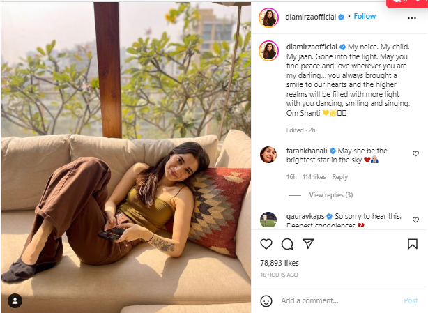 दीया मिर्जा ने इस इमोशनल पोस्ट में येलो हार्ट, टाइगर और हैंड जॉइनिंग इमोजी शेयर किया है। दीया मिर्जा ने जैसे ही अपनी भतीजी की मौत की खबर अपने इंस्टाग्राम अकाउंट पर शेयर की, उनके फैन्स, इंडस्ट्री के फॉलोअर्स और दोस्तों ने कमेंट कर अपनी संवेदना व्यक्त करना शुरू कर दिया। बॉलीवुड अभिनेता सुनील शेट्टी, गौरव कपूर, ईशा गुप्ता, सिद्धांत चतुर्वेदी, रिद्धिमा कपूर साहनी और कई अन्य लोगों ने दीया पर जमकर कमेंट किया है।