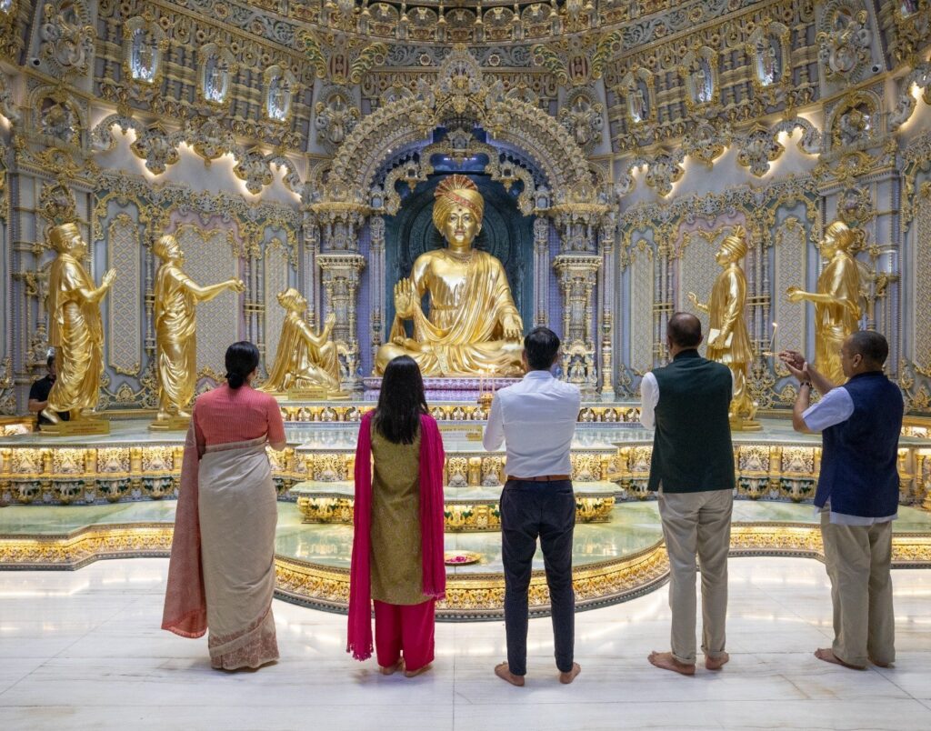 नई दिल्ली; भारत में G-20 शिखर सम्मेलन में शामिल होने दिल्ली पहुंचे यूनाइटेड किंगडम के प्रधानमंत्री ऋषि सुनक और उनकी पत्नी अक्षता मूर्ति ने प्रसिद्ध अक्षरधाम मंदिर में में दर्शन पूजन किया. इस दौरान उन्होंने मंदिर के प्रबंध कमेटी के सदस्य व संतों से मुलाकात भी की. ऋषि सुनक ने अपनी धर्म पत्नी के साथ के साथ मंदिर परिसर का भ्रमण भी किया. यूनाइटेड किंगडम के प्रधानमंत्री ऋषि सुनक और उनकी पत्नी अक्षता मूर्ति की भ्रमण के दौरान की फोटो सोशल मीडिया पर छाई हुई हैं.