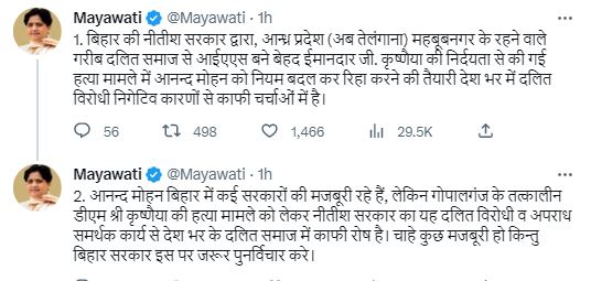 बसपा सुप्नीमो ने कहा- आनन्द मोहन बिहार में कई सरकारों की मजबूरी रहे हैं, लेकिन गोपालगंज के तत्कालीन डीएम कृष्णैया की हत्या मामले को लेकर नीतीश सरकार का यह दलित विरोधी व अपराध समर्थक कार्य से देश भर के दलित समाज में काफी रोष है. उन्होंने मांग की चाहे कुछ मजबूरी हो किन्तु बिहार सरकार इस पर जरूर पुनर्विचार करे.