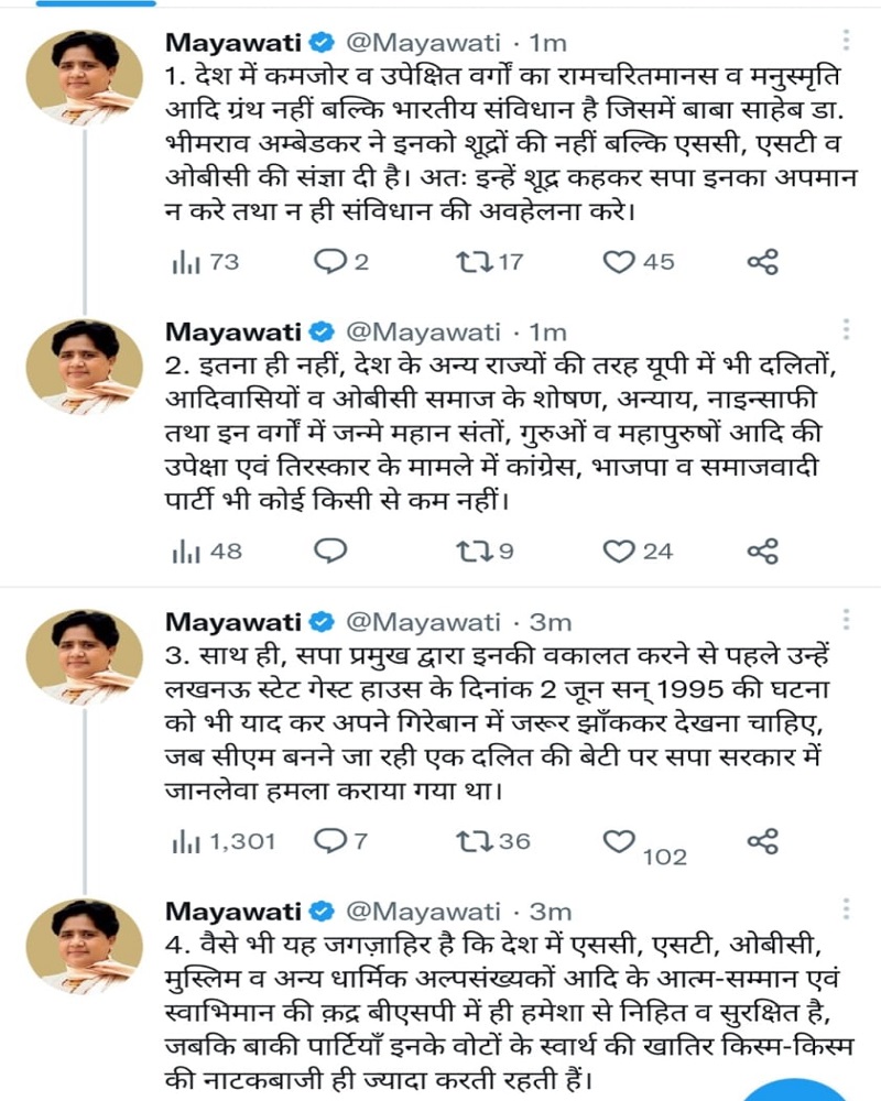 शूद्र पर छिड़े सियासी संग्राम में बसपा सुप्रीमो मायावती भी कूद गई है। मायावती ने शुक्रवार को ट्वीट कर लिखा है कि रामचरितमानस और मनुस्मृति कमजोर वर्ग के लिए नहीं है, कमजोर,उपेक्षित वर्ग के लिए संविधान है। बाबा साहेब ने ऐसे लोगों को SC/ST, OBC की संज्ञा दी, इसलिए इन्हें शूद्र कहकर सपा अपमान न करे। समाजवादी पार्टी संविधान की अवहेलना न करे। SC/ST, OBC के तिरस्कार के मामले में सपा,कांग्रेस और BJP कोई किसी से कम नहीं है।