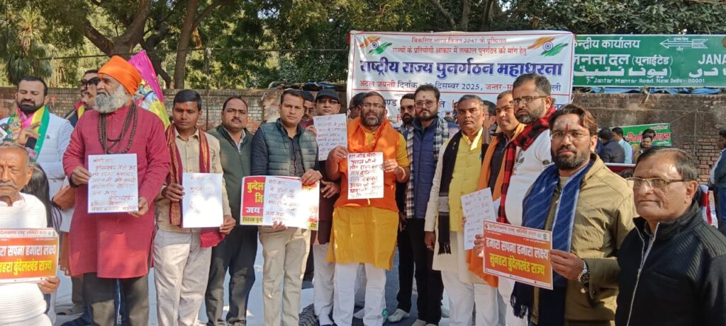 नई दिल्ली : अटल बिहारी वाजपेयी की जयंती के अवसर पर जंतर-मंतर पर आयोजित राष्ट्रीय राज्य पुनर्गठन महाधरना में बुंदेलखंड राष्ट्र समिति के राष्ट्रीय अध्यक्ष एवं पर्यावरण पहरूवा प्रवीण पांडेय ‘बुंदेलखंडी’ ने रिकॉर्ड 50वीं बार अपने खून से पत्र लिखकर पृथक बुंदेलखंड राज्य की माँग उठाई। उन्होंने कहा कि यह मुद्दा केवल भावनात्मक नहीं, बल्कि राष्ट्रीय विकास से जुड़ा संवैधानिक प्रश्न है।