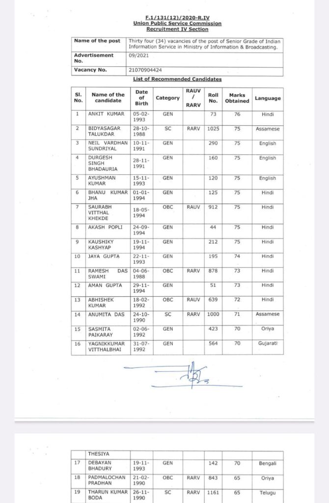 बता दें केंद्रीय सूचना प्रसारण मंत्रालय के अधीन सीनियर ग्रेड ऑफिसर के 34 पदों पर चयन के लिए परीक्षा आयोजित की थी. इसमें हिंदी, अंग्रेज़ी और कई क्षेत्रीय भाषाओं के पद शामिल हैं. लंबे समय से इस नियुक्ति के परिणाम का अभ्यर्थी इंतजार कर रहे थे क्योंकि किन्हीं कारणों से ये भर्ती कोर्ट में फंस गई थी. अब जाकर परिणाम घोषित हुआ है तो अभ्यर्थियों के चेहरे पर खुशी आई है.